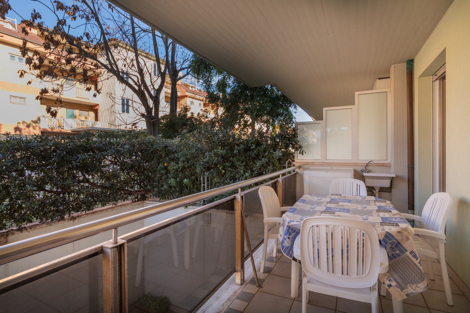 Il balcone esterno di 12 mq è arredato con tavolo e sedie.