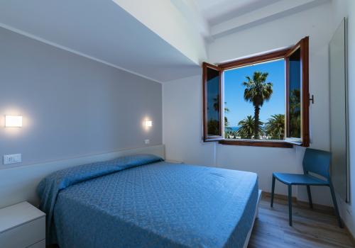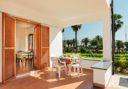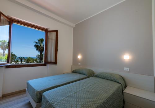 L'appartamento è composto da una camera con letto matrimoniale, una camera con due letti a castello e un letto singolo e un bagno con finestra e tutti i comfort (lavandino, doccia, bidet e WC). Soggiorno con divano letto matrimoniale e angolo cottura. L'appartamento è dotato di aria condizionata, TV, cassaforte, lavatrice e Wi-Fi. Una veranda esposta a nord attrezzata con tavolo e sedie e l'atra esposta a sud con vista mare laterale.