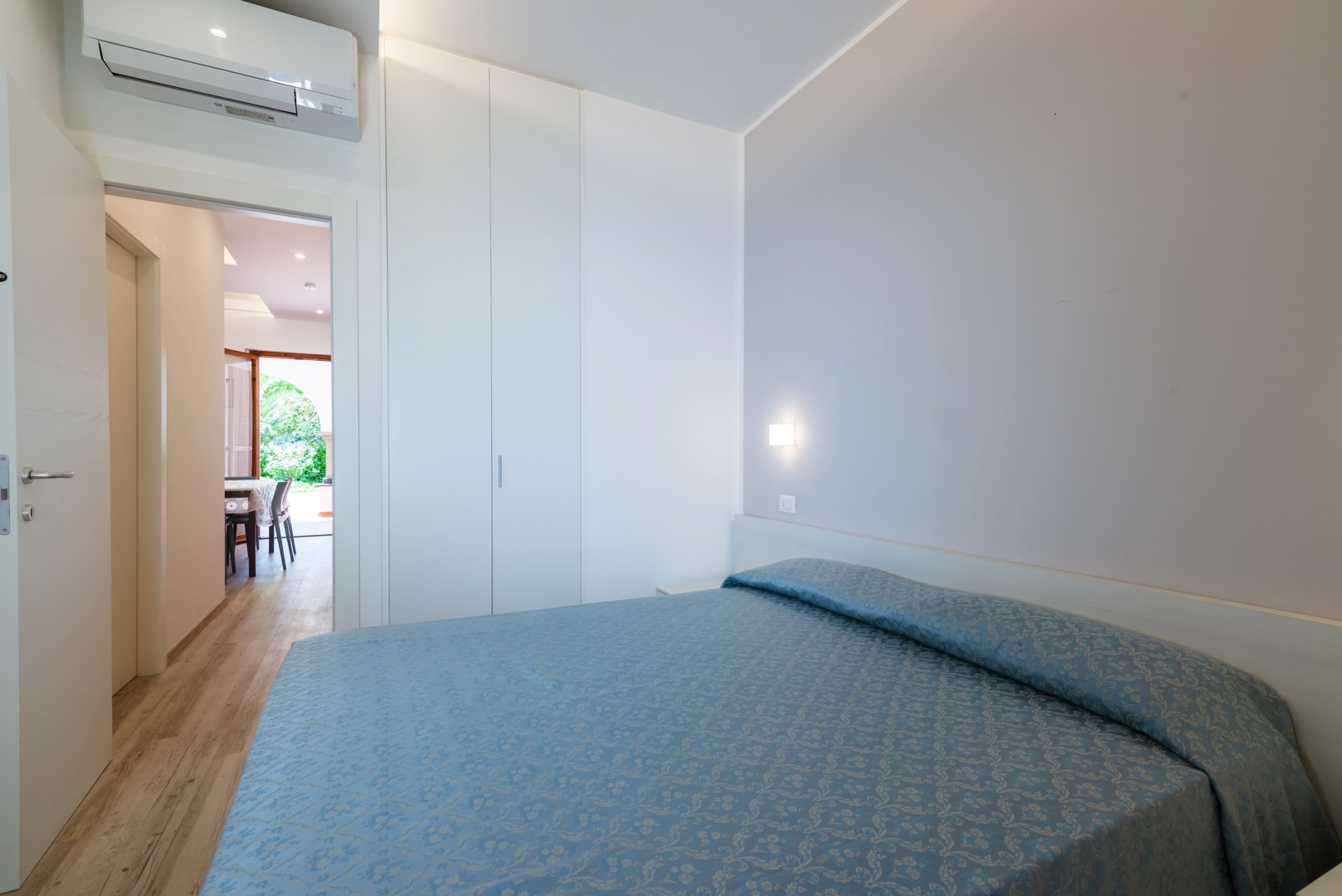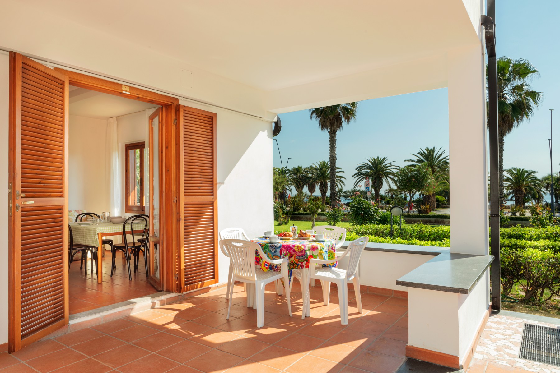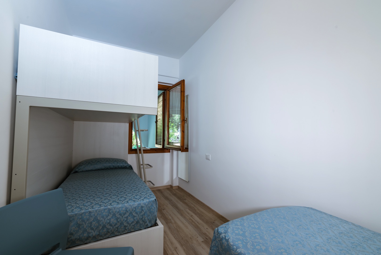 L'appartamento è composto da una camera con letto matrimoniale, una camera con due letti a castello e un letto singolo e un bagno con finestra e tutti i comfort (lavandino, doccia, bidet e WC). Soggiorno con divano letto matrimoniale e angolo cottura. L'appartamento è dotato di aria condizionata, TV, cassaforte, lavatrice e Wi-Fi. Una veranda esposta a sud attrezzata con tavolo e sedie e l'atra esposta a nord con giardino.