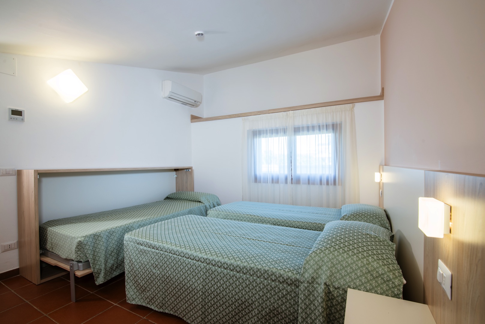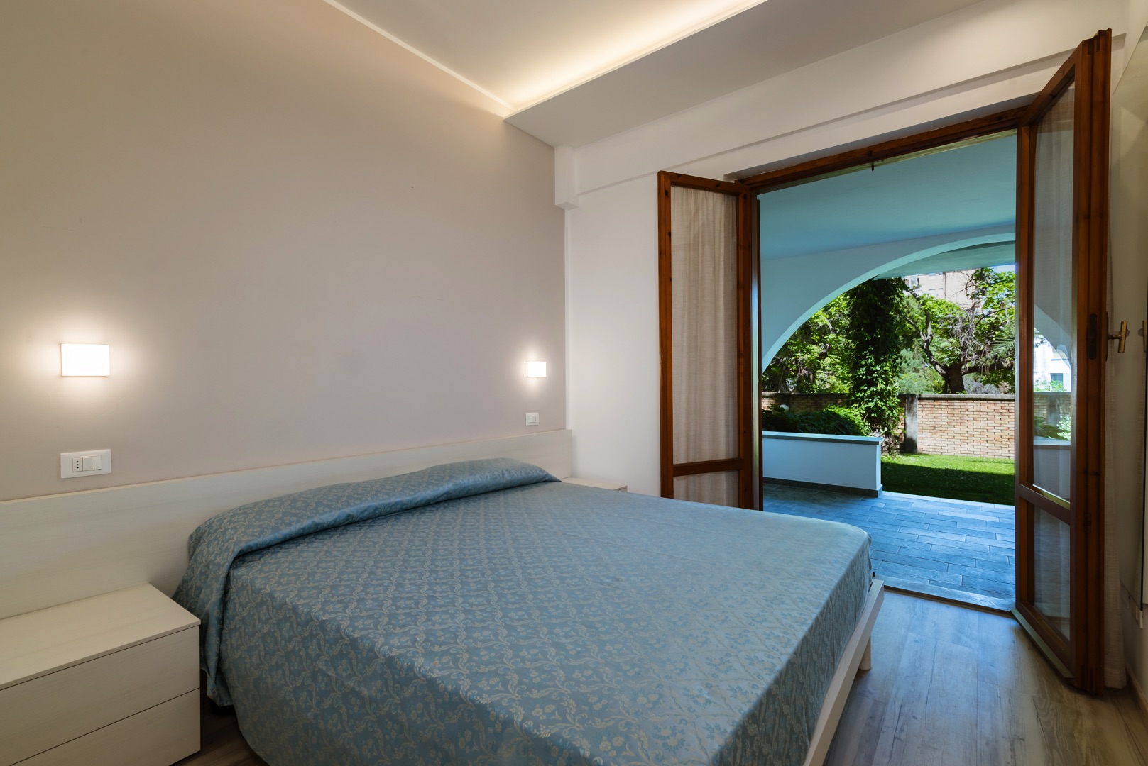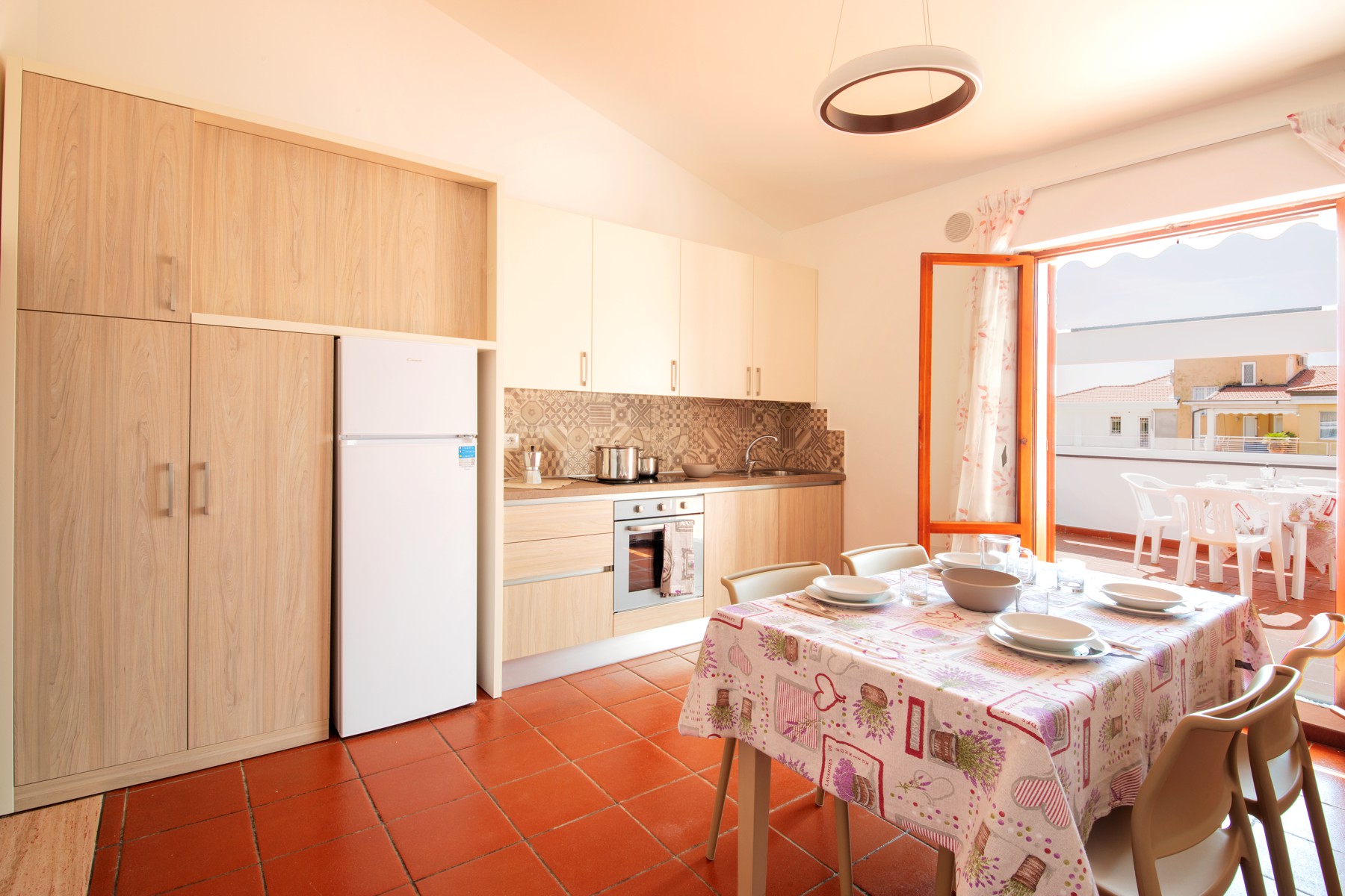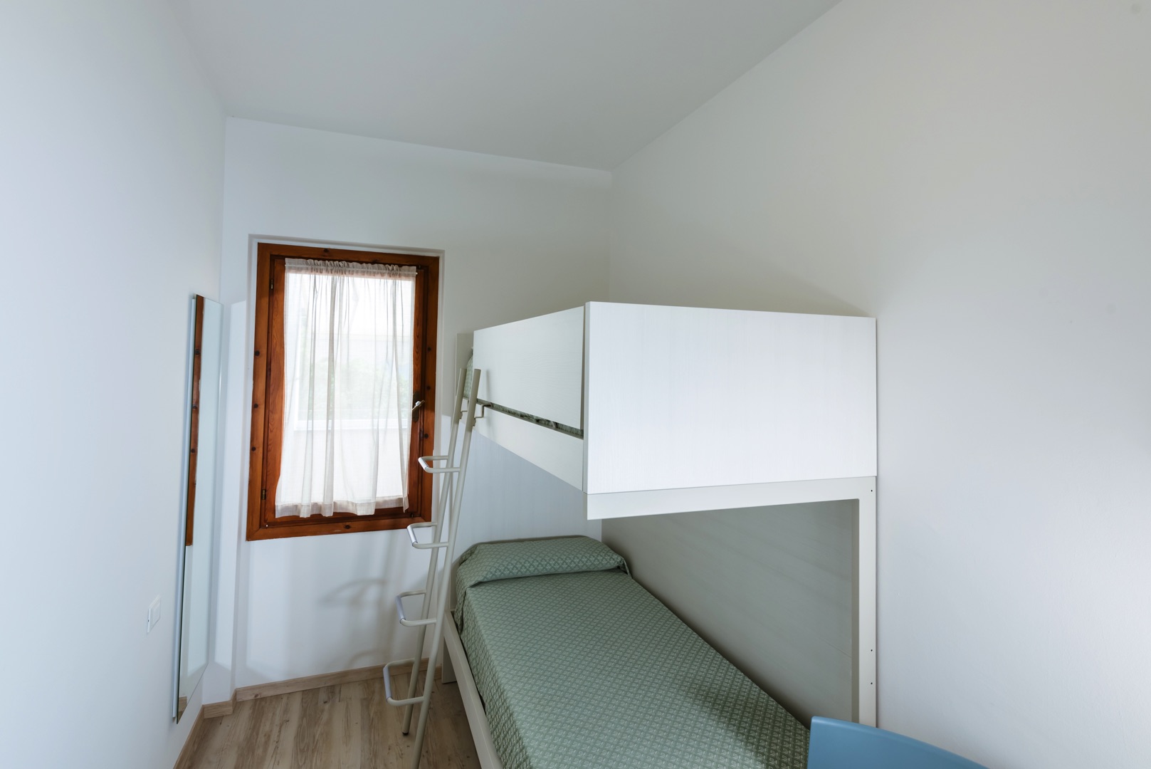 L'appartamento è composto da una camera con letto matrimoniale, una camera con due letti a castello e un letto singolo e un bagno con finestra e tutti i comfort (lavandino, doccia, bidet e WC). Soggiorno con divano letto matrimoniale e angolo cottura. L'appartamento è dotato di aria condizionata, TV, cassaforte, lavatrice e Wi-Fi. Una veranda esposta a sud attrezzata con tavolo e sedie e l'atra esposta a nord con giardino.